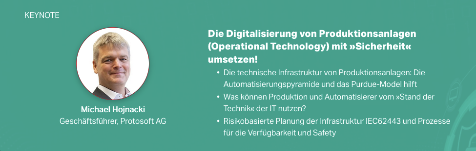 Keynote mit dem Titel „Die Digitalisierung von Produktionsanlagen (Operational Technology) mit »Sicherheit« umsetzen!“ von Michael Hojnacki, Geschäftsführer unseres Partners Protosoft AG, München